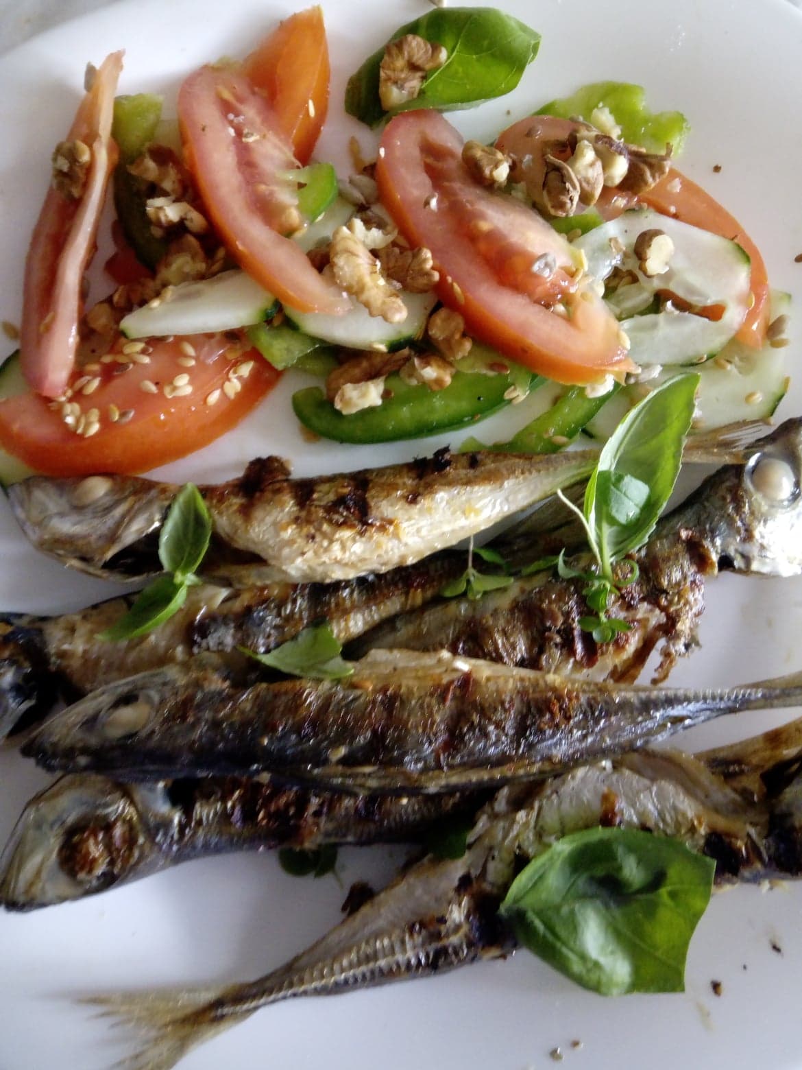 Hoje para o almoço grelhei carapaus e fiz uma salada que me soube pela vida.